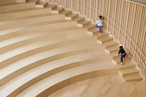 幼儿园起伏的屋顶与周围四合院的灰色屋顶形成鲜明对比,同时为这里的孩子们提供了一个很大的玩耍空间:天台、四合院、老树、天空,孩子们“上天下地”、“窜来窜去”,鼓励孩子们激发探索世界的可能!