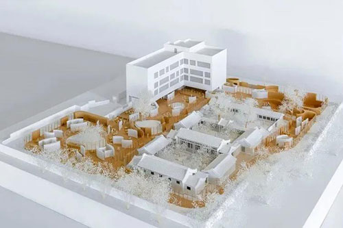 这所幼儿园由国际建筑大师马岩松带领MAD团队设计打造,一座 18 世纪的四合院被幼儿园“环抱”着,形成“一老一小”的“代际融合”布局。