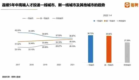2017-2021连续五年,新一线城市对中高端人才和应届生的吸引力持续增强,正在逐步追平一线城市。