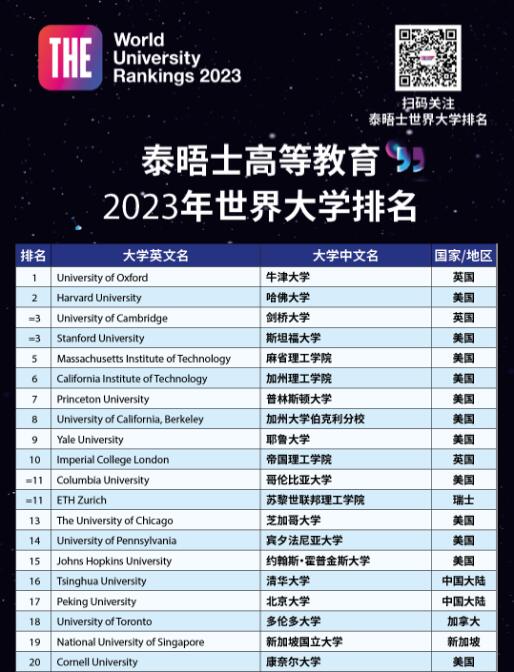 2023年泰晤士高等教育2023年THE世界大学排名前100学校名单如下: