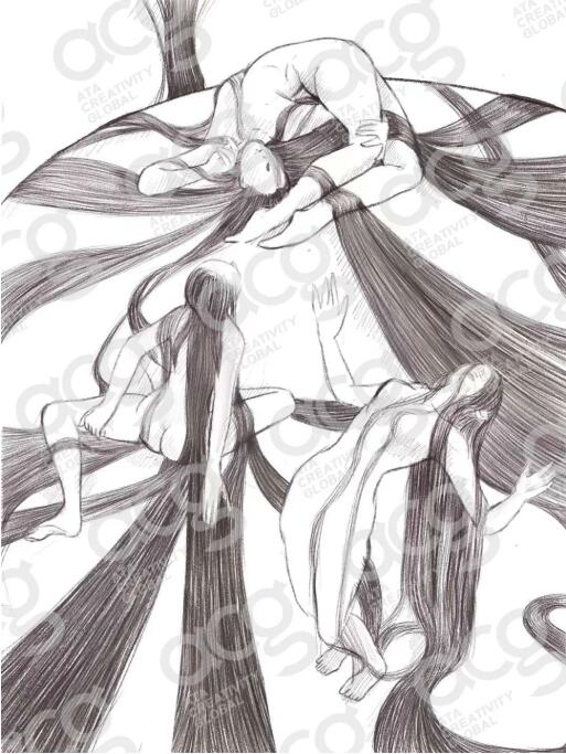 但随着长大和阅读,我逐渐建立起自己的身份认同和性别认同,也渐渐留长了头发。回看这段经历,对我来说深刻又滑稽,造成厌女症的原因对我来说是一个值得思考的议题。这幅画是我成长经历的记录,也是我对厌女症的反思。