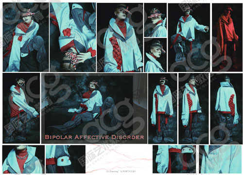 叶同学:最喜欢第二个项目,是关于躁郁症的。我本身很喜欢这种探讨性的主题,就是很有兴趣去多了解,所以做得过程也很有干劲。这个项目中我通过面料和印花更多的来表现主题吧,比如天鹅绒比鹿皮便宜一些,但是质感差不多,是一种很高档的感觉,硬挺,体现出一种压力,不放松的感觉,我就大面积的用了这种材质。还有红色的紧实毛衣,是一种很紧实、束缚的感觉,鱼尾半裙,上面是红血丝刺绣,整体就是想体现服饰的质感,高档的感觉。