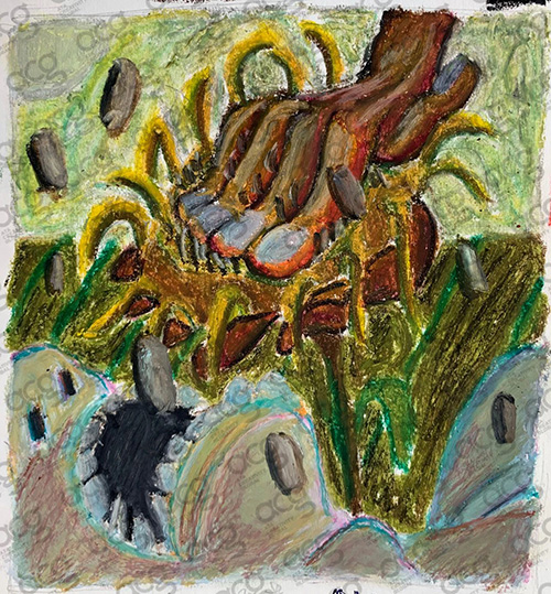 Z,高度的自律,对绘画的专注度极高,能够快速掌握新知识和实操的能力,对绘画媒介的敏感度很高,纸本油画和油画棒的结合,层次的叠加和干湿变化的运用,配合荒诞怪力的叙事和干净利索的笔触让他的作品抓住了所有人的眼球。