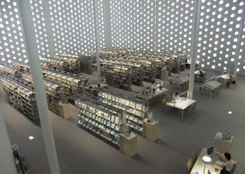 图书馆的墙面上全是圆形的小窗,阳光投进窗孔,给室内灌进了无数的“透明感”。